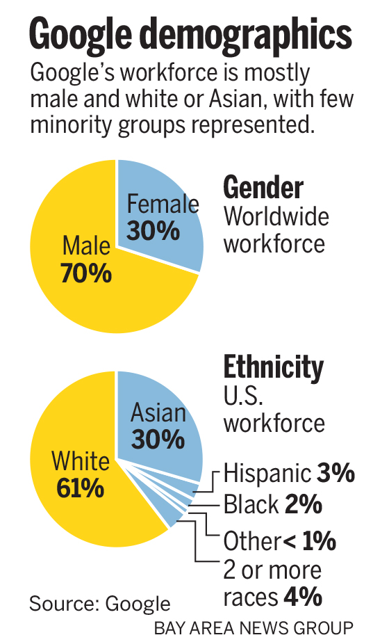 Quinn: Google workers predominantly male and white, rare peek shows by San Jose Mercury News.